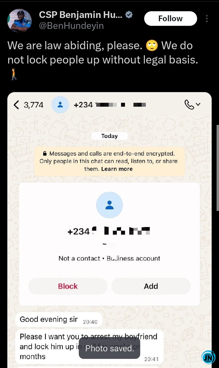 The Nigerian Police Force Public Relations Officer, Benjamin Hundeyin, has addressed a peculiar request from a lady who demanded the arrest of her boyfriend, sparking curiosity and amusement across social media platforms.