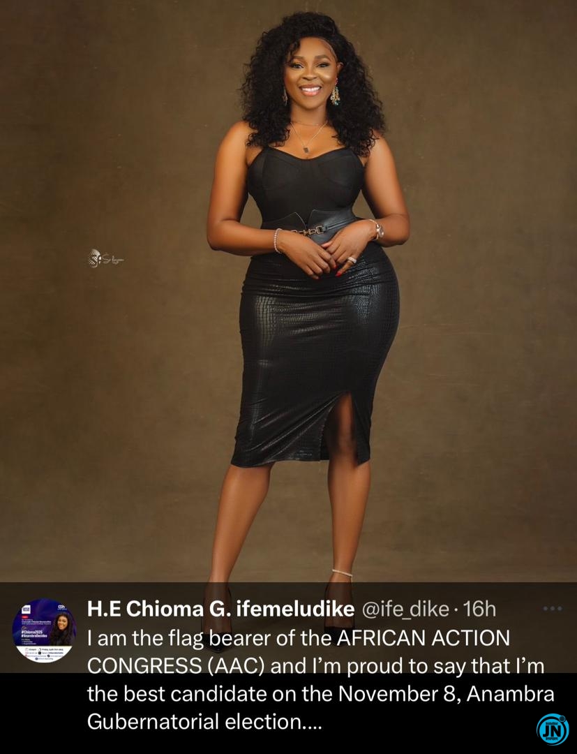 In her post on X (formerly Twitter), she boldly declared: “I am the flag bearer of the African Action Congress (AAC) and I’m proud to say that I’m the best candidate for the November 8 Anambra gubernatorial election.” This statement signaled her determination to be taken seriously as a candidate and not just a public figure exploring politics. It also emphasized her commitment to representing her constituents and bringing about meaningful change in the state.