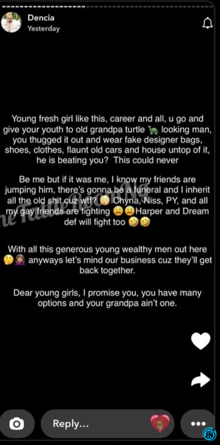 In a lengthy post shared via her Instagram story, Dencia did not hold back as she addressed what she sees as a growing trend among young women—marrying older, wealthy men in exchange for a luxurious lifestyle that often comes with emotional strain.