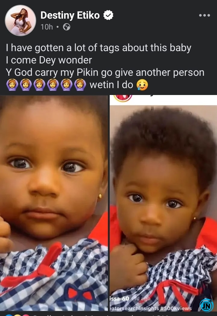 Responding to the buzz, Destiny Etiko took to her Facebook page to acknowledge the viral photos. She explained that she had received numerous tags and messages from fans and followers who were excitedly pointing out the resemblance between her and the baby. In her post, Destiny expressed her astonishment and amusement, writing: “I have gotten a lot of tags about this baby. I come Dey wonder. Why God carry my Pikin go give another person 🙆♀️🙆♀️🙆♀️🙆♀️🙆♀️🙆♀️ wetin I do ?.🥲”