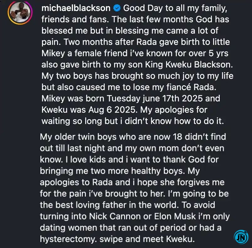 The statement quickly went viral, attracting thousands of reactions from fans and followers. While some applauded his honesty and humor, others criticized him for disrespecting his fiancée’s trust. Despite the mixed reactions, Michael maintained that he is focused on being responsible and present for all his children.