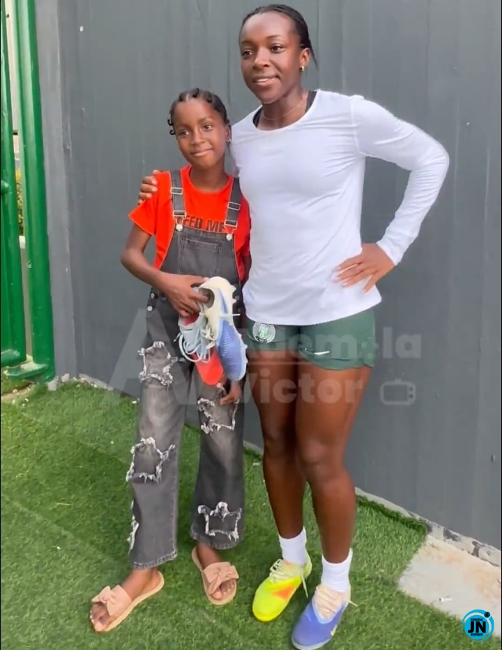 A heartwarming video has captured a touching moment as Super Falcons star, Michelle Alozie, generously gifted a young fan her personal football boots in Abeokuta, ahead of their crucial match against Benin Republic.