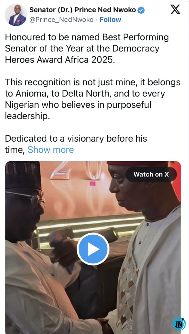 Taking to his official X (formerly Twitter) page, the businessman and politician shared a detailed post celebrating his recent achievement as the Best Performing Senator of the Year at the prestigious Democracy Heroes Award Africa 2025.