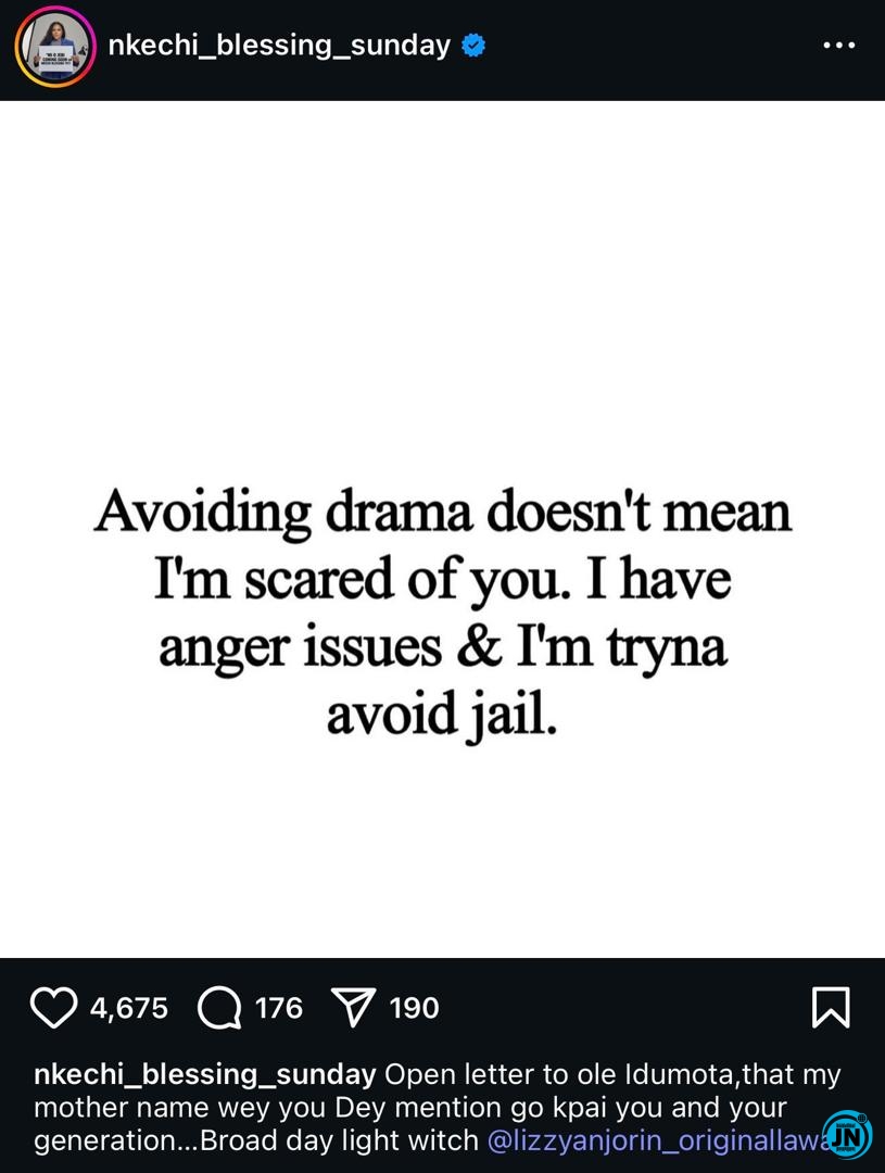 “Just because I’m avoiding you doesn’t mean I’m scared. I have anger issues. I’m just keeping myself out of jail,” Nkechi wrote, hinting that she was choosing restraint over confrontation.