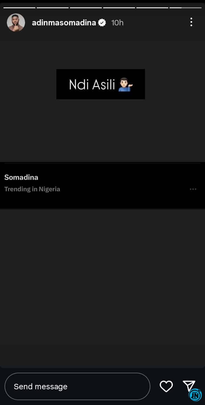 He posted the phrase “Ndi Asili,” which is an Igbo term meaning “gossips” or “rumor mongers,” indirectly addressing those speculating about his connection to the ongoing drama.