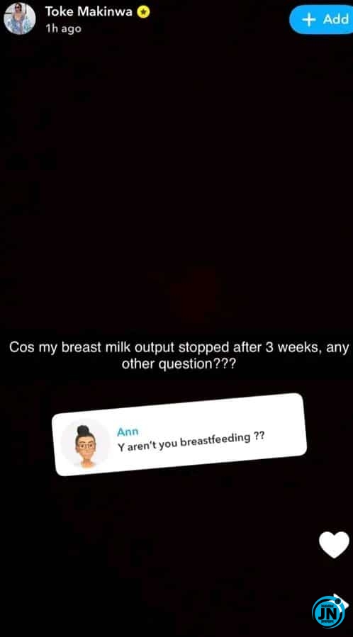 During a recent interaction with her followers on Snapchat, a fan curiously asked Toke Makinwa if she was still breastfeeding her baby girl, as many new mothers often share updates about their breastfeeding journey online.