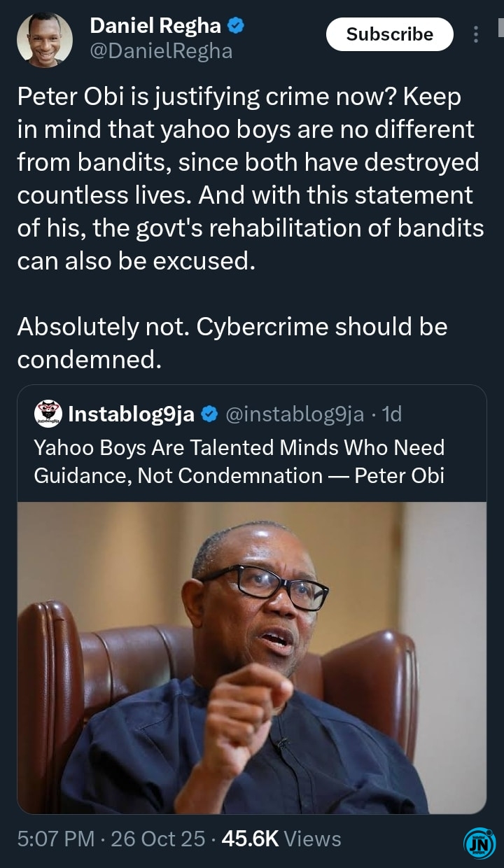 Despite Obi’s clarification, Daniel Regha took to social media to express his strong disagreement. Regha argued that the statement could be misinterpreted as justifying criminal behaviour and potentially normalizing illegal activities. He tweeted: “Peter Obi is justifying crime now? Keep in mind that Yahoo boys are no different from bandits, since both have destroyed countless lives. And with this statement of his, the government’s rehabilitation of bandits can also be excused. Absolutely not. Cybercrime should be condemned.”