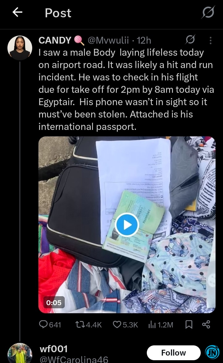 Candy’s tweet read: “I saw a male body laying lifeless today on Airport Road. It was likely a hit-and-run incident. He was to check in his flight due for takeoff at 2 PM by 8 AM today via EgyptAir. His phone wasn’t in sight so it must’ve been stolen. Attached is his international passport. His backpack was torn, his clothes scattered on the floor. They probably went away with his money too. Broken bones, scraps of the vehicle that had the collision with him was on the floor.”