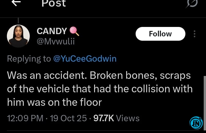 In a follow-up post, Candy described the scene in more detail, confirming that it appeared to be an accident. She noted that Chukwuemeka’s backpack was torn, his clothes were scattered across the road, and broken vehicle parts were found nearby. She also mentioned the possibility that the perpetrators may have taken his money along with his phone, adding to the misfortune.