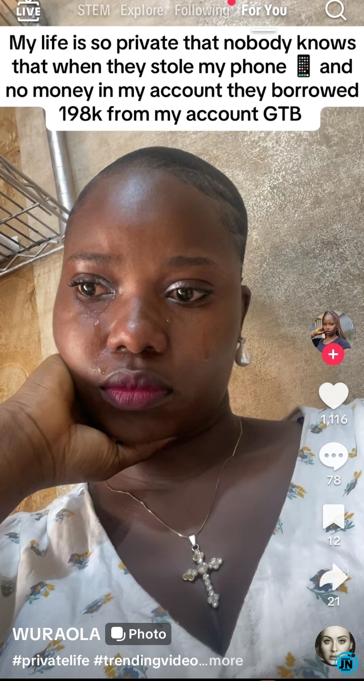 A young Nigerian lady identified as Wuraola has taken to social media to express her deep frustration and heartbreak after thieves who stole her phone reportedly used her bank account to borrow a huge sum of N198,000.