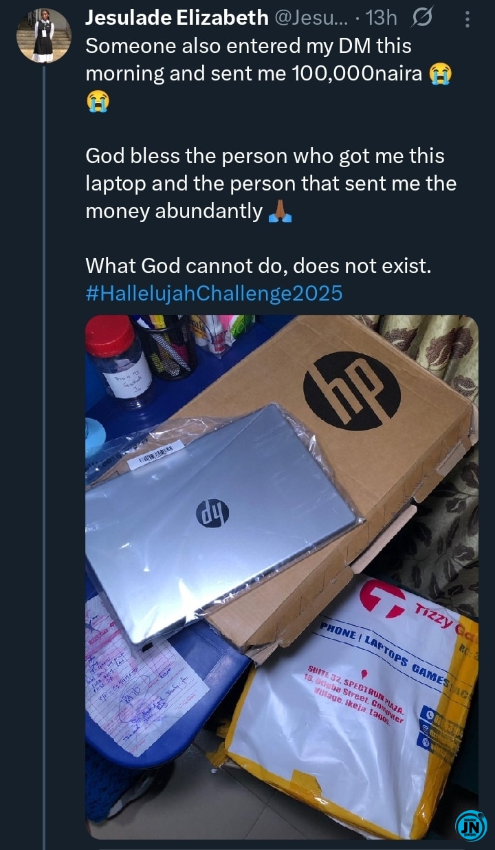 In her words: “Someone also entered my DM this morning and sent me 100,000 naira 😭😭. God bless the person who got me this laptop and the person that sent me the money abundantly 🙏🏾. What God cannot do, does not exist. #HallelujahChallenge2025.”