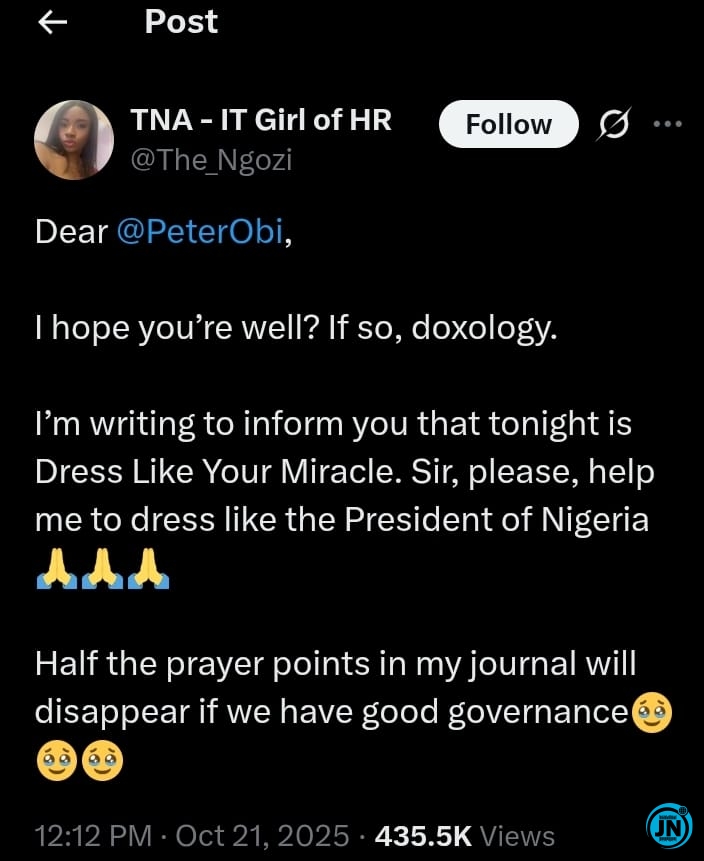 Her viral post read, “Dear @PeterObi, I hope you’re well? If so, doxology. I’m writing to inform you that tonight is Dress Like Your Miracle. Sir, please, help me to dress like the President of Nigeria 🙏🙏🙏. Half the prayer points in my journal will disappear if we have good governance 🥹🥹🥹.”