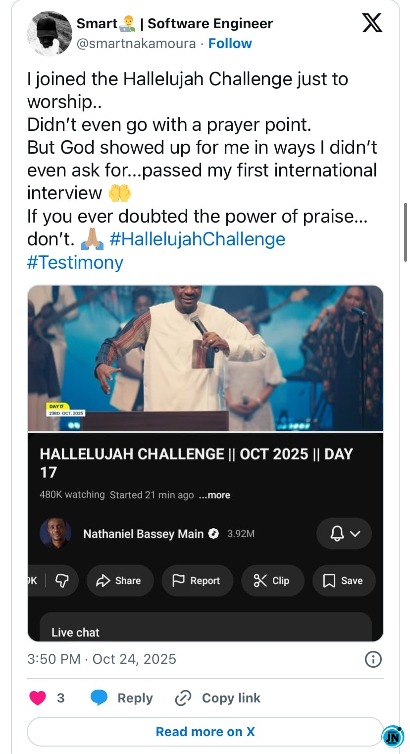 A Nigerian man has stirred excitement online after sharing how he miraculously passed an international job interview shortly after joining the popular Hallelujah Challenge hosted by gospel singer Nathaniel Bassey.