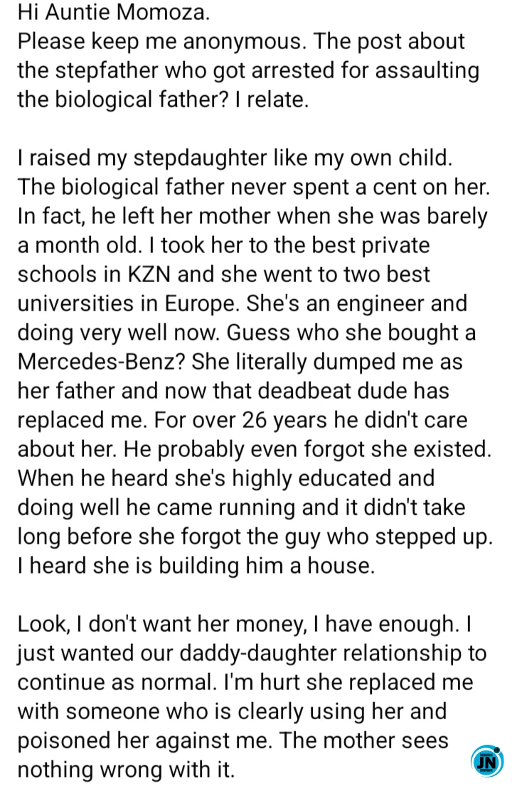 “Hi Auntie Momoza. Please keep me anonymous. The post about the stepfather who got arrested for assaulting the biological father? I relate. I raised my stepdaughter like my own child. The biological father never spent a cent on her. In fact, he left her mother when she was barely a month old. I took her to the best private schools in KZN and she went to two best universities in Europe. She’s an engineer and doing very well now. Guess who she bought a Mercedes-Benz? She literally dumped me as her father and now that deadbeat dude has replaced me. For over 26 years he didn’t care about her. He probably even forgot she existed. When he heard she’s highly educated and doing well he came running and it didn’t take long before she forgot the guy who stepped up. I heard she is building him a house.”