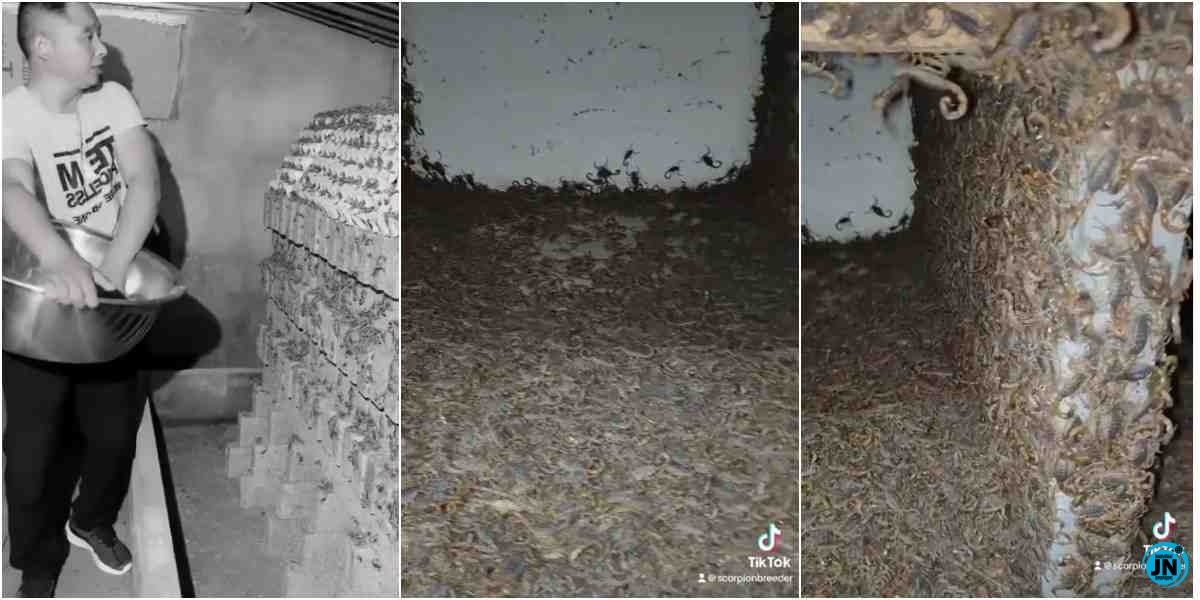 A daring Nigerian man has captured the attention of thousands online after sharing a video that revealed his extraordinary business — a large-scale scorpion farm where he breeds, handles, and extracts venom from hundreds of deadly scorpions for commercial sale.