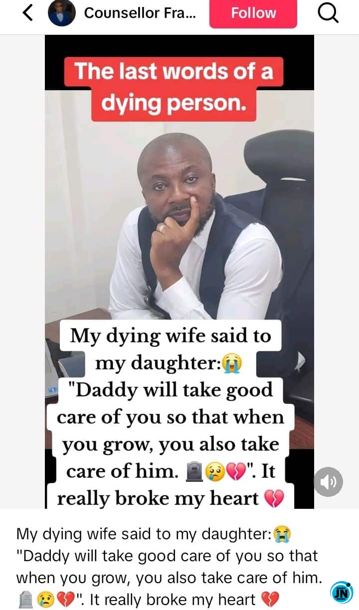 The widower, identified as Counsellor Pinwilliams, shared the touching moment in a recent TikTok post, opening up about one of the most painful experiences of his life following the loss of his wife.