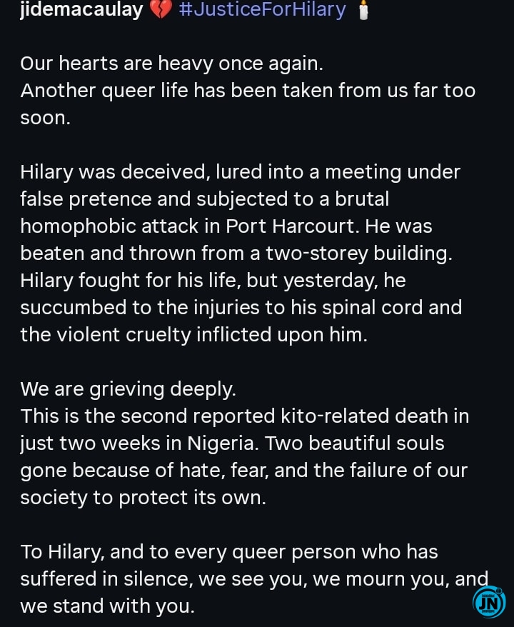 The heartbreaking news was first shared by Jide Macaulay, a prominent LGBTQ+ rights activist and founder of the House of Rainbow, through an emotional Instagram post that shed light on the cruel circumstances surrounding Hilary’s final moments.