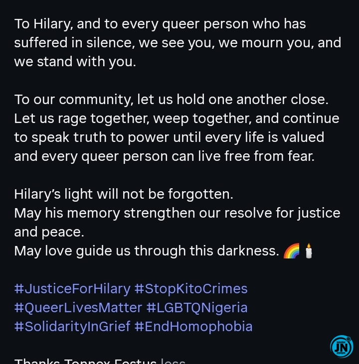 Following the announcement of Hilary’s death, tributes have poured in from across Nigeria and the diaspora. Activists, allies, and friends have taken to various platforms to mourn the loss of a life cut short by hate and ignorance. Many described Hilary as a kind, vibrant young man who deserved love and acceptance, not violence and discrimination.